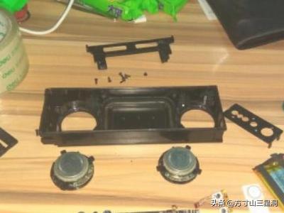 2.把对面一面白片也抠下来,从开关那边往这边到捅,就把音箱里面主体给捅出来了,把这个麦克风扣下来。外面就是这个铝合金壳子了,可以丢一边。